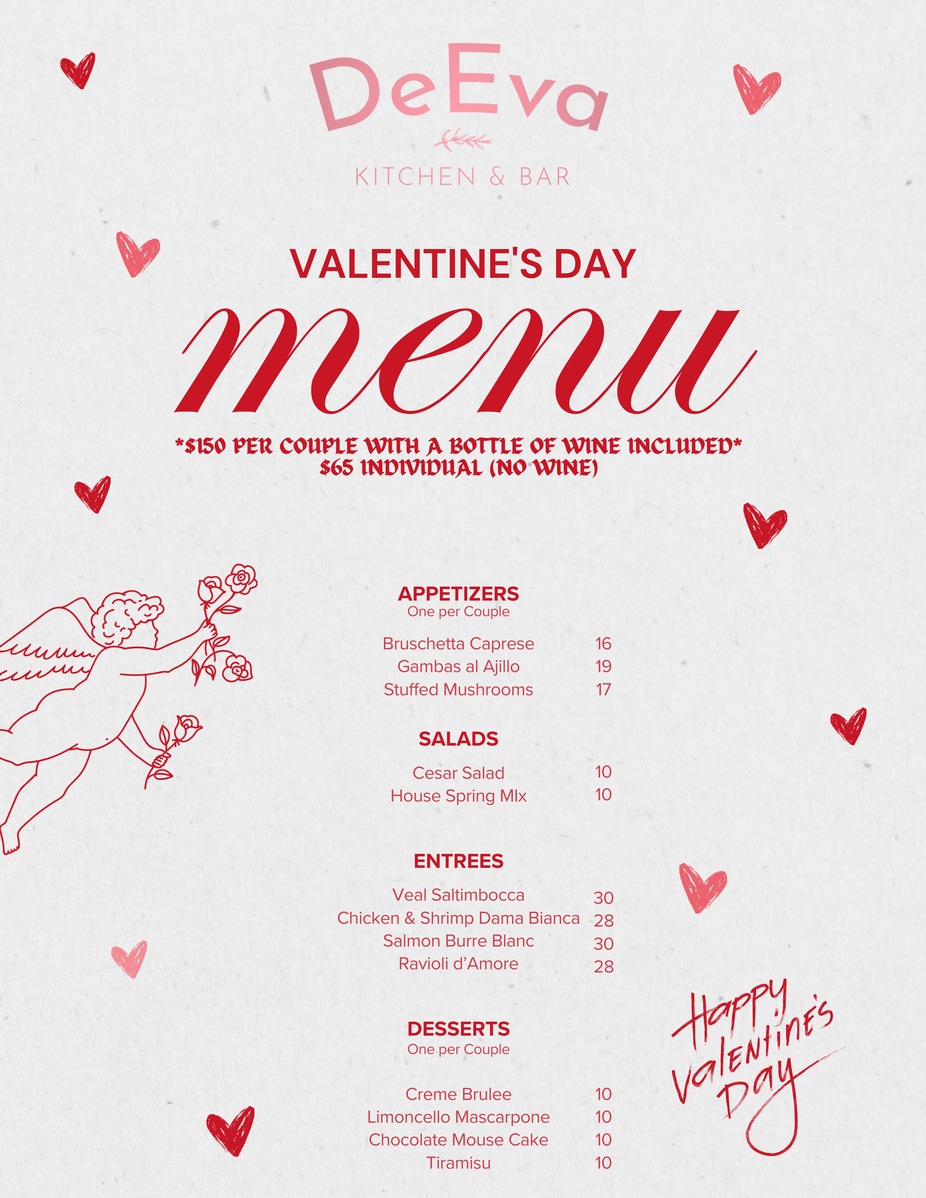 Valentine’s Day is a truly special evening at DeEva Kitchen & Bar. Our chefs are crafting a delicious, thoughtfully curated menu designed to be both exciting and perfectly suited for the occasion.