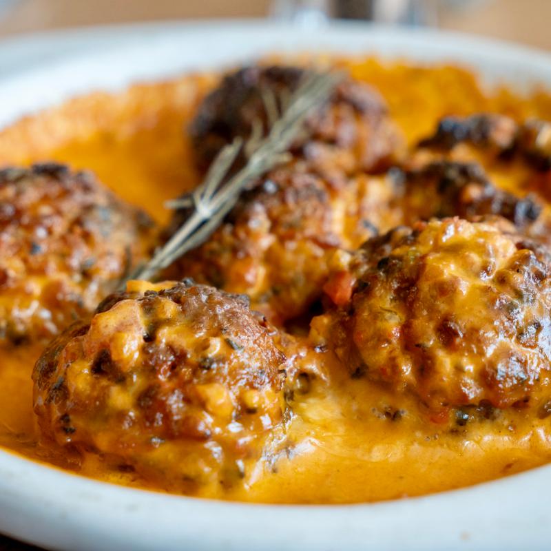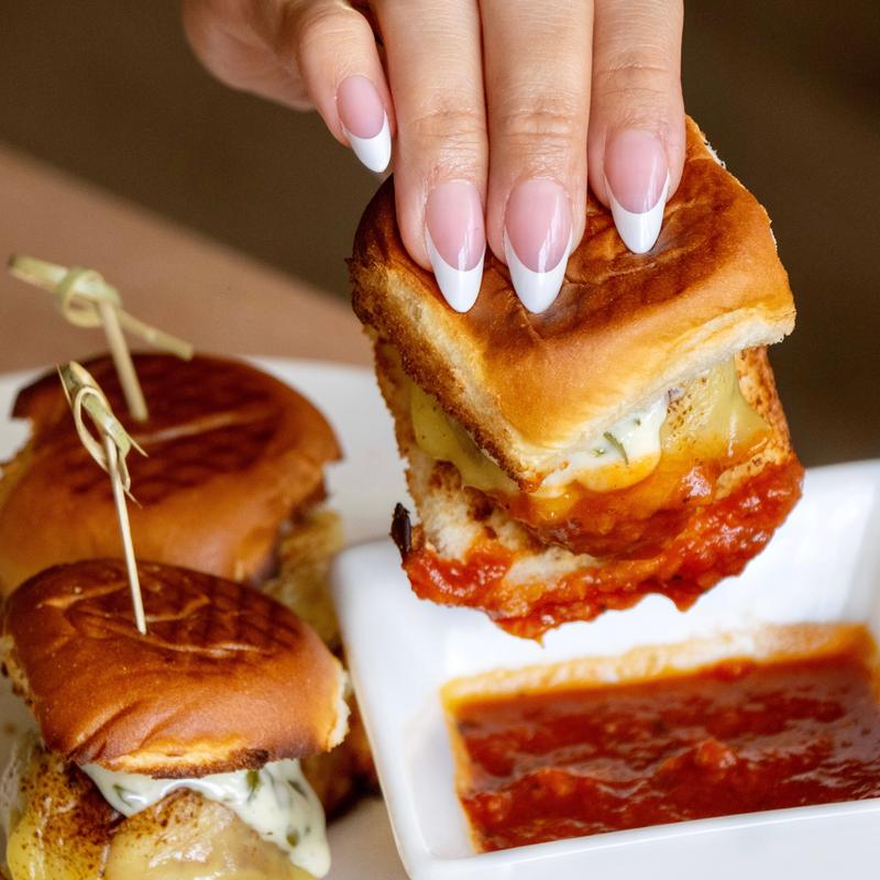 3 mini toasted brioche buns with our 2oz homemade grilled meatball, Dijonnaise, smoked Gouda, side of marinara.