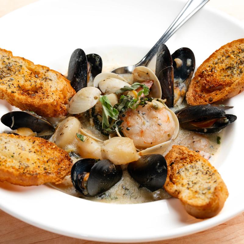 Our version of the famous seafood stew: Scallops, clams, mussels and shrimp in garlic, butter and white wine broth served with garlic bread crostini.