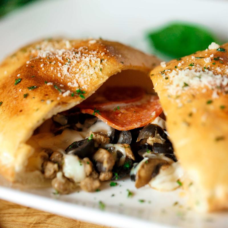 Folded pizza dough stuffed with pepperoni, sausage, mushrooms, olives, mozzarella cheese and Marinara sauce on the side.