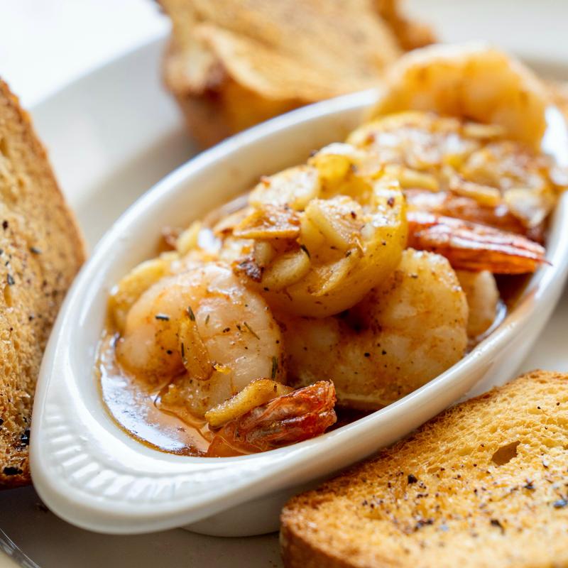 13-15 shrimp EVOO, sliced garlic, red pepper flakes, lemon peel, toast.