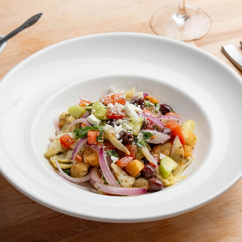 NO lettuce salad, ripe Roma tomatoes, Ciabatta toasted bread chunks, red onions, black Kalamata olives, cucumbers, roasted bell peppers, artichoke hearts, feta cheese, basil and parsley tossed in lemon juice and EVOO dressing.