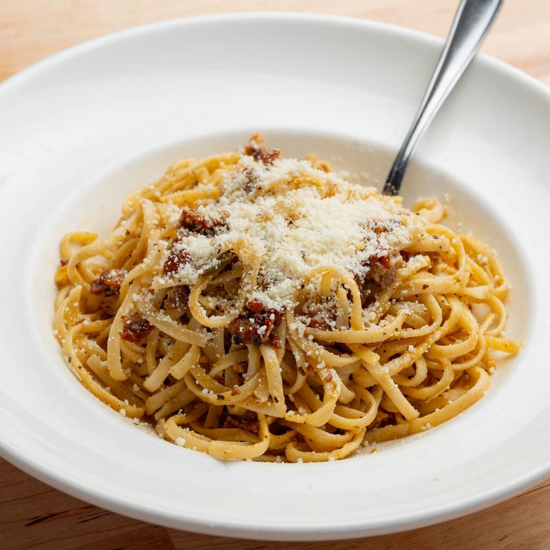 Smoked bacon, chili pepper, egg yolks, pecorino Romano, cracked black pepper and sweet corn on linguini.