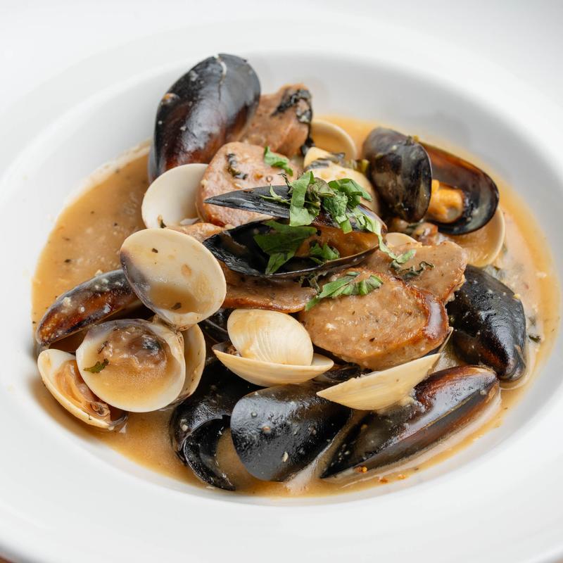 Sauteed with Italian sausage, roasted bell peppers, garlic, basil and butter white wine sauce.