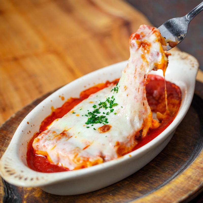 Twice baked stacks of fresh pasta sheets, Bolognese sauce, Parmesan and Ricotta cheese in pink vodka sauce.