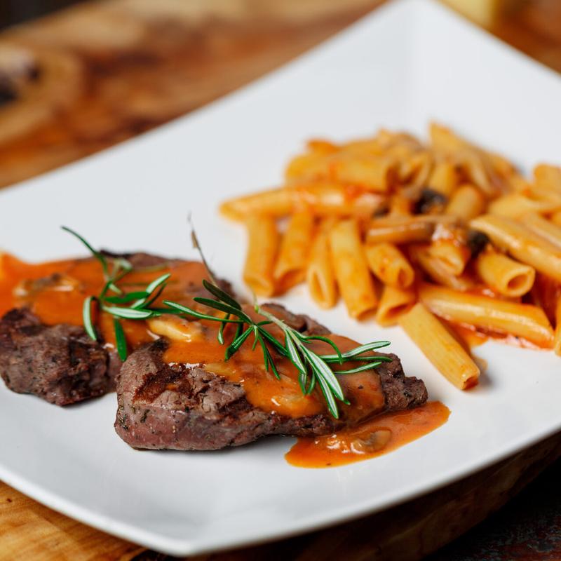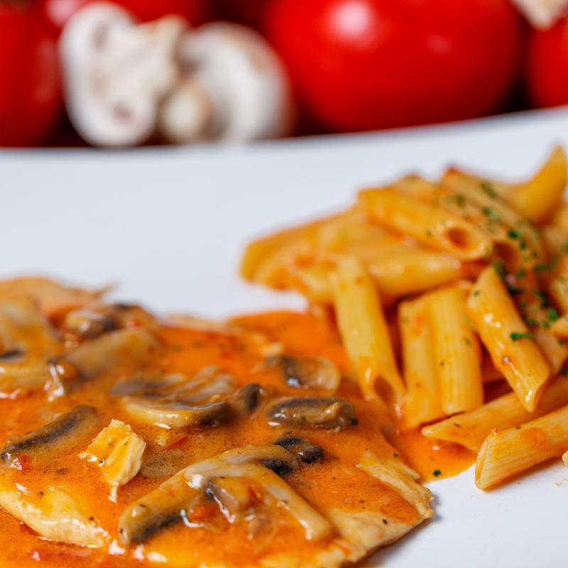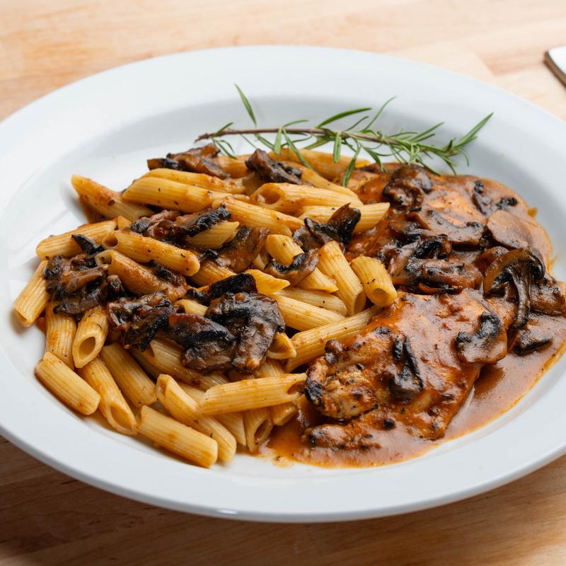 Sautéed chicken breast with fresh mushrooms in Marsala wine sauce, Penne pasta.
