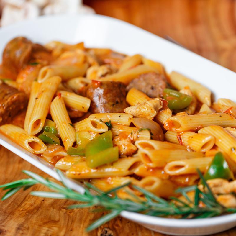 Diced chicken breast, Italian sausage, onions and bell peppers over penne pasta in white wine broth and a touch of Marinara sauce (Try it a bit spicy upon request, add red pepper flakes) (S).