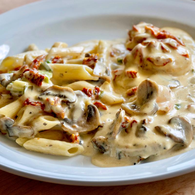 Sautéed chicken breast & 2 jumbo shrimp, fresh mushrooms, green onions, sun dried tomatoes in brandy cream sauce.
