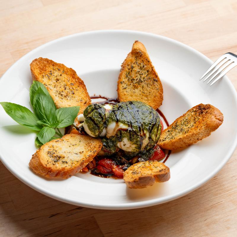 Creamy burrata, cherry tomatoes, garlic, basil, EVOO, pesto sauce and balsamic glaze with garlic toast.