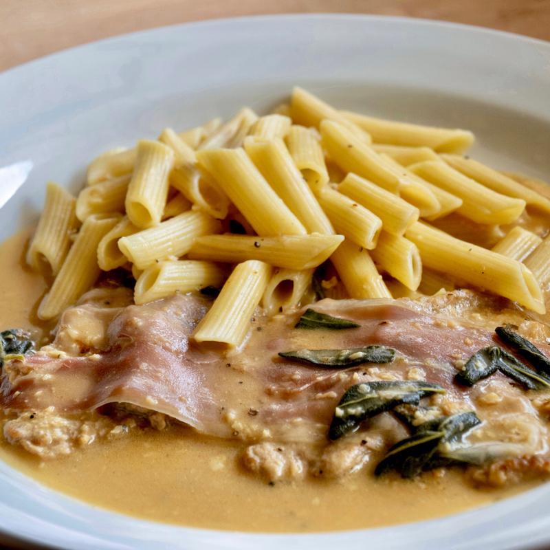 Sautéed veal scaloppini, prosciutto and sage in white wine, butter sauce.
