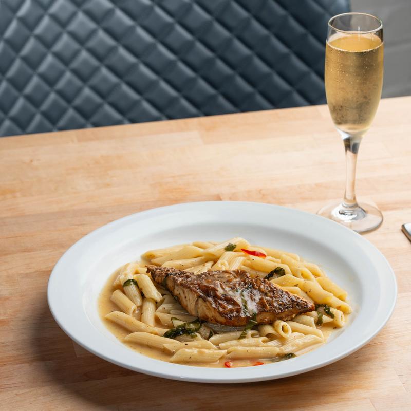 Seared filet of red snapper in white wine, fresh garlic, Fresno peppers, lemon zest.